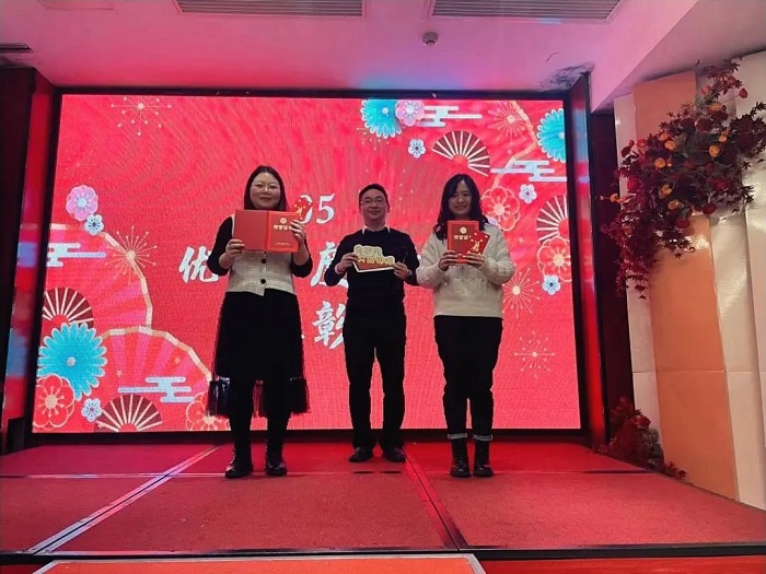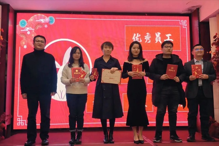 优秀员工:工程部黄大卫、阜阳办何斐、成控部张莉、销售部祁宁、财务部胡丹丹(从右到左)